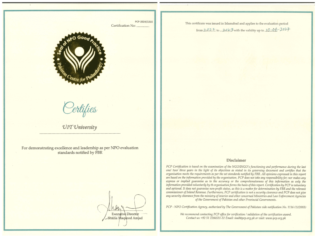 UIT University has been awarded the prestigious Seal of NPO Good Practice by the Pakistan Centre for Philanthropy. This recognition acknowledges our dedication to meeting the highest standards of non-profit excellence and leadership, as evaluated by the FBR. We are honored to be recognized for our contributions to the community and our commitment to making […]