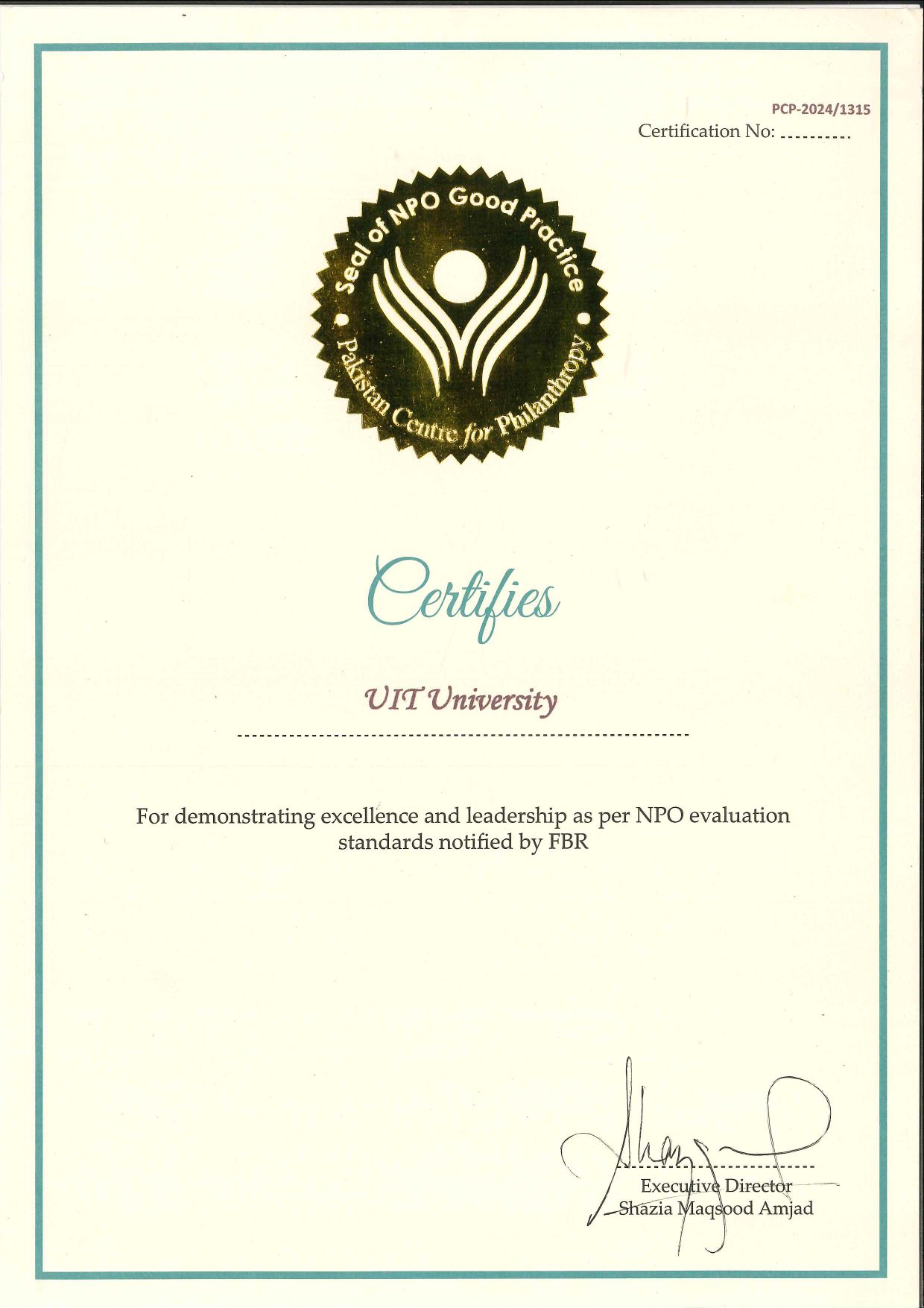 UIT University has been awarded the prestigious Seal of NPO Good Practice by the Pakistan Centre for Philanthropy. This recognition acknowledges our dedication to meeting the highest standards of non-profit excellence and leadership. We are honored to be recognized for our best practices and commitment to making a positive impact to the community.