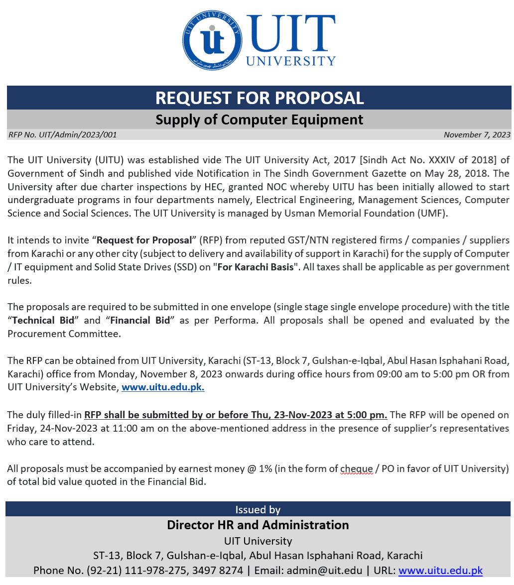 The RFP can be obtained from UIT University, Karachi (ST-13, Block 7, Gulshan-e-lqbal,Abul Hasan lsphahaniRoad, Karachi) office from Monday, November 8, 2023 onwards during office hours from 09:00 am to 5:00 pm OR from UIT University’s Website, www.uitu.edu.pk.